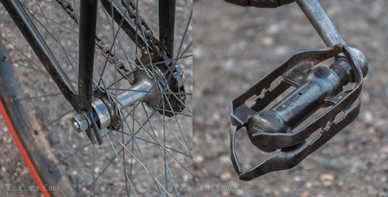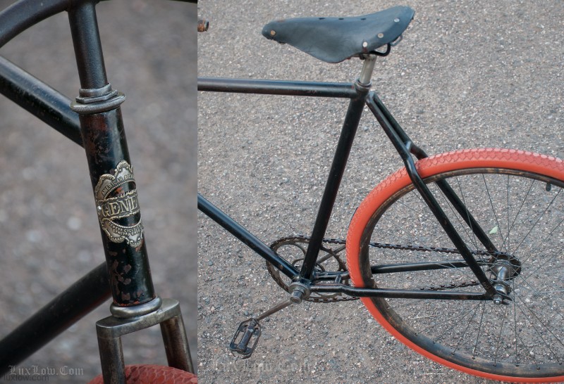 This Old Geneva has been Lux Low Patina Restored and Resuscitated. The Paint is Original, Lux Low deep cleaned and sealed. The Bike has unique parts: Two Piece Cranks with removable Chainring, Bottom Bracket, Drop bars with Cork Grips, Unique quill Pedals, and Block Skiptooth Chain. The wood wheels are refinished finished wood rims laced to New Departure M and Rear Early New Departure Fixed Gear Hub. Tires are New Red Solid remake Button Tread Tires. Cool Old Geneva Bicycle completely rebuilt, Possibly to be Ridden Gingerly, but mainly for Display in a Collection.This Amazing Bicycle is Rebuilt, Cleaned, and Sealed. This Bicycle would Be Perfect For a Collection, Conversation or Decoration. Click here for Details of the Lux Low Vintage Patina Restoration Process on this Bike.