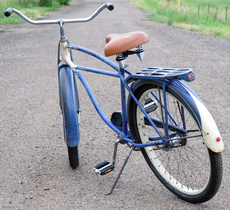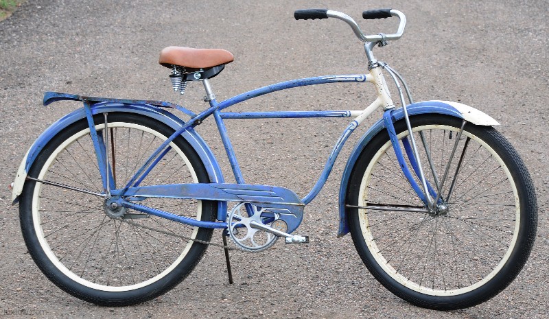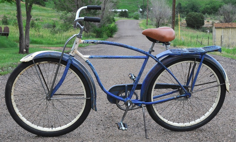 Cool Old Pair of Blue Postwar Schwinn Ballooner His and Hers Cruiser Bicycles. 1949 Ladies DX / Hornet Ladies Ballooner Bicycle and a 1950 Men’s Straight Bar Ballooner Bike. A Pair of Classic Schwinn Quality Cruiser Bikes, Completely Rebuilt and Patina Restored, Ready for your pedal power.