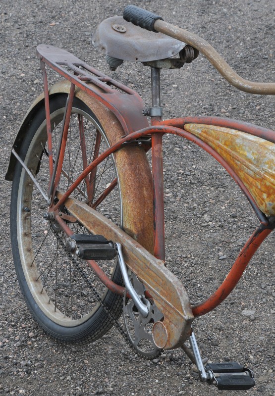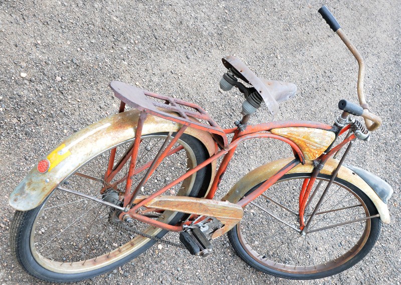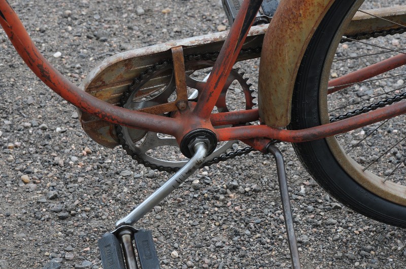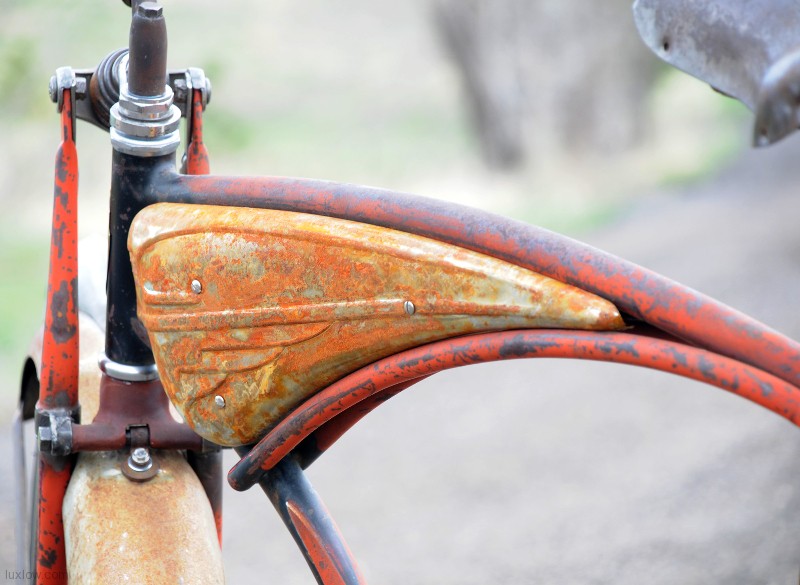 This is a 1953 Antique Schwinn Red Phantom Bicycle Blessed with Aged Patina, it has Original AS Springer, Phantom Saddle (What’s Left), AS Pedals, 6 Hole Rack, Chain Guard, Fenders with working Train Light (LED Retro Fitted), and Schwinn Script Grips. The Ratty Tank is a Schwinn Reproduction. This is a Full size adult Mens Bike with Rebuilt and Trued Schwinn S-2 Ballooner Wheels and New 26″ x 2.125″ Brick Pattern Blackwall Tires. This Classic Townie Rides Smooth, has Great Patina, and much Style. The A Tough Schwinn Cruiser Bike that Rides Smooth in Style.Click here for Details of the Lux Low Vintage Patina Restoration Process on this Bike.
