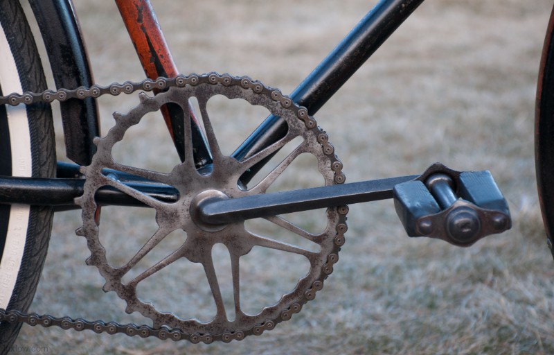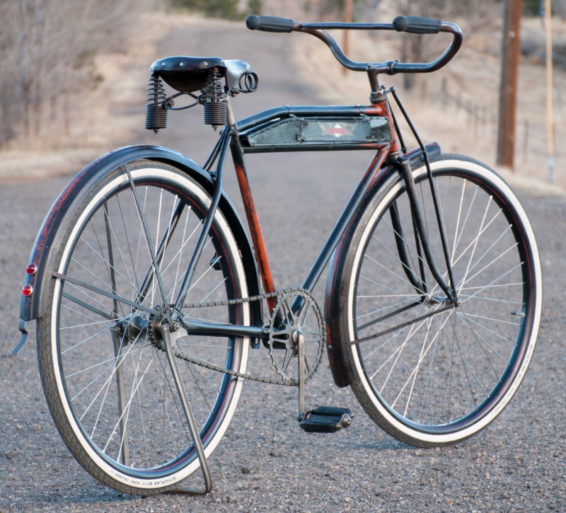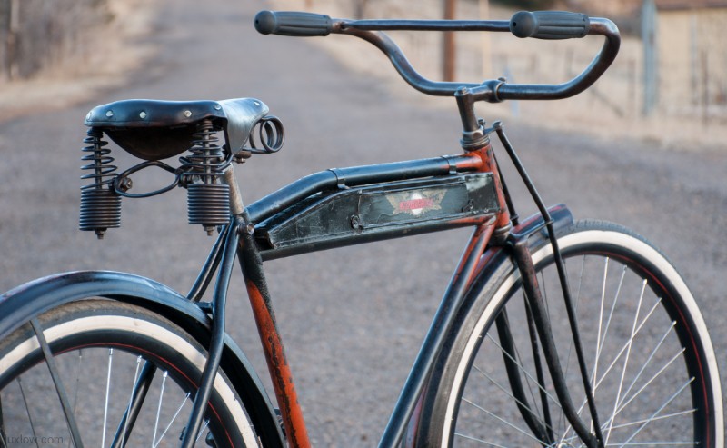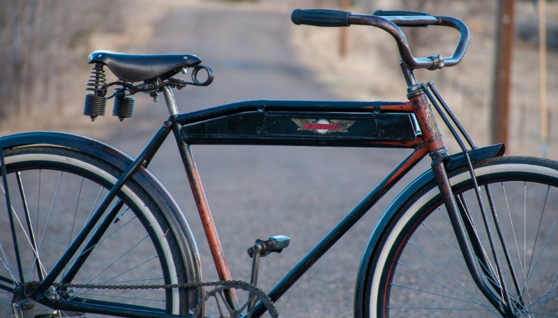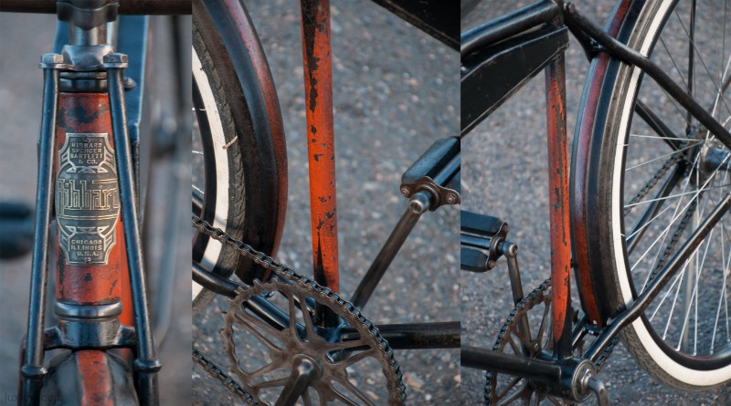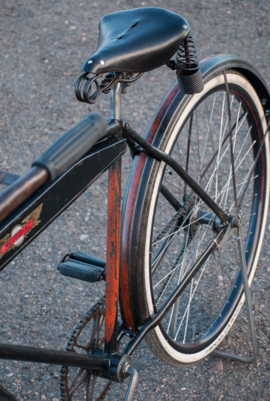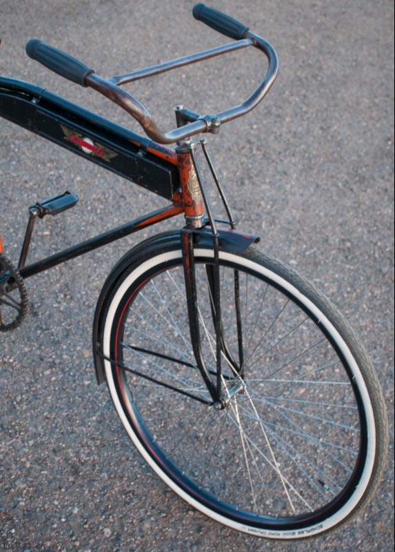 This Schwinn built Hibbard has some original paint, Lux Low patina preserved and is adorned with original parts. The wheels are New Lux Low custom built 28″ wheels to make this bike road worthy. They are made with Velocity Blunt 35 rims that mimic wood rims. The Rims black with orange pin striping with distressed patina aging to look like old original wood wheels. The wheels are laced with stainless steel double butted spokes to a New Departure front Barrel hub and a nice rear New Departure Model A Coaster Brake Hub. The Tires are 28″ x 1.40″ Schwalbe Road Cruiser Whitewall Tires. The wheels add new tech with a retro look that will let you ride this baby for many miles effortlessly in comfort. The Drive is Skiptooth Chain and the Seat is a Lux Low Restored Early Leather Saddle. This Baby is Built to Ride and Preserving the Classic old look and Patina, To Give you a Stylish old Bike that Rides Effortlessly and will turn heads as you Roll By.She is completely rebuilt with riding in mind, you can put her on a pedestal or ride her for miles.