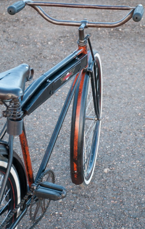 This Schwinn built Hibbard has some original paint, Lux Low patina preserved and is adorned with original parts. The wheels are New Lux Low custom built 28″ wheels to make this bike road worthy. They are made with Velocity Blunt 35 rims that mimic wood rims. The Rims black with orange pin striping with distressed patina aging to look like old original wood wheels. The wheels are laced with stainless steel double butted spokes to a New Departure front Barrel hub and a nice rear New Departure Model A Coaster Brake Hub. The Tires are 28″ x 1.40″ Schwalbe Road Cruiser Whitewall Tires. The wheels add new tech with a retro look that will let you ride this baby for many miles effortlessly in comfort. The Drive is Skiptooth Chain and the Seat is a Lux Low Restored Early Leather Saddle. This Baby is Built to Ride and Preserving the Classic old look and Patina, To Give you a Stylish old Bike that Rides Effortlessly and will turn heads as you Roll By.She is completely rebuilt with riding in mind, you can put her on a pedestal or ride her for miles.