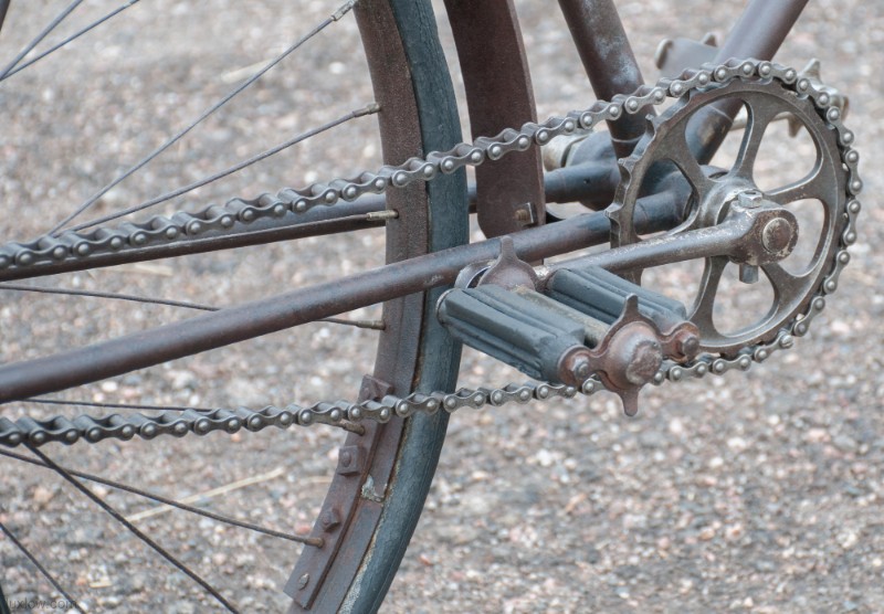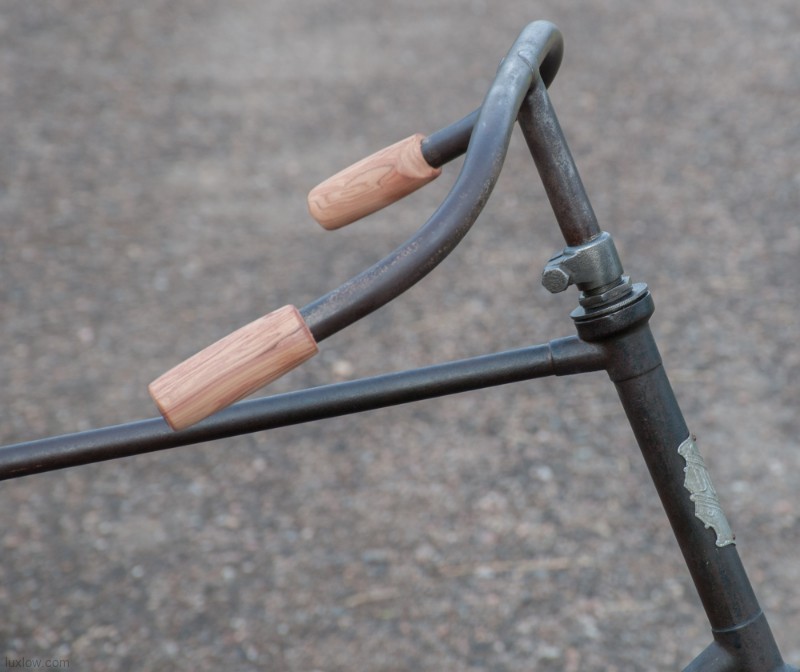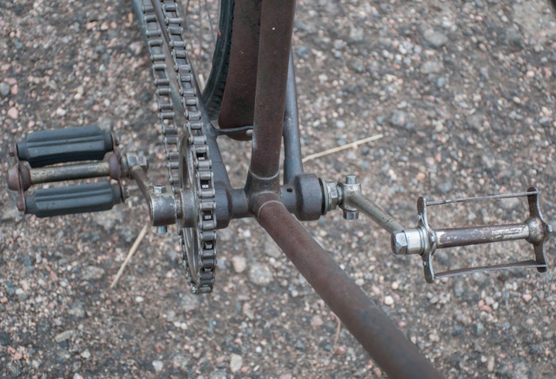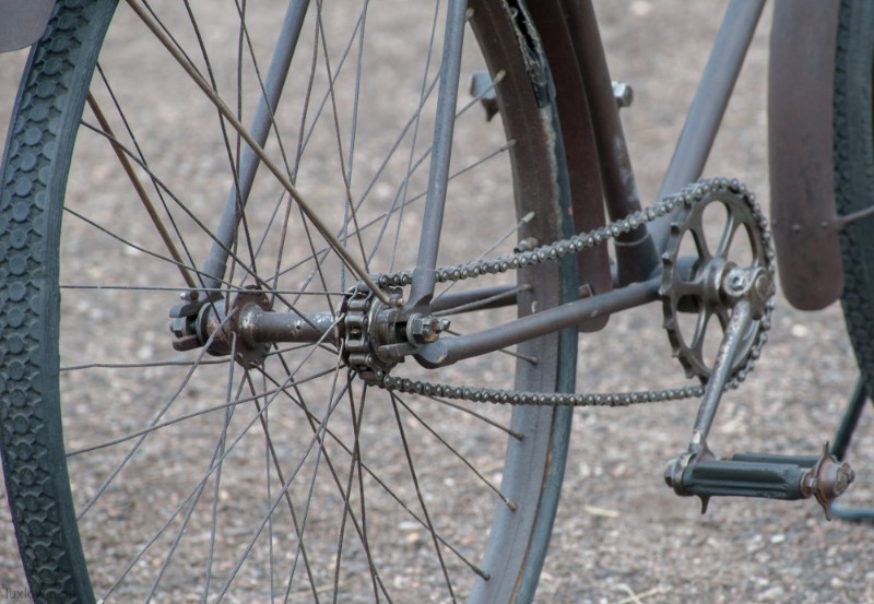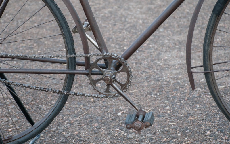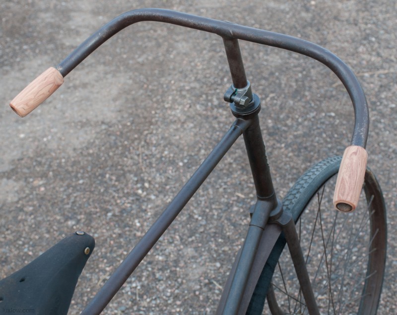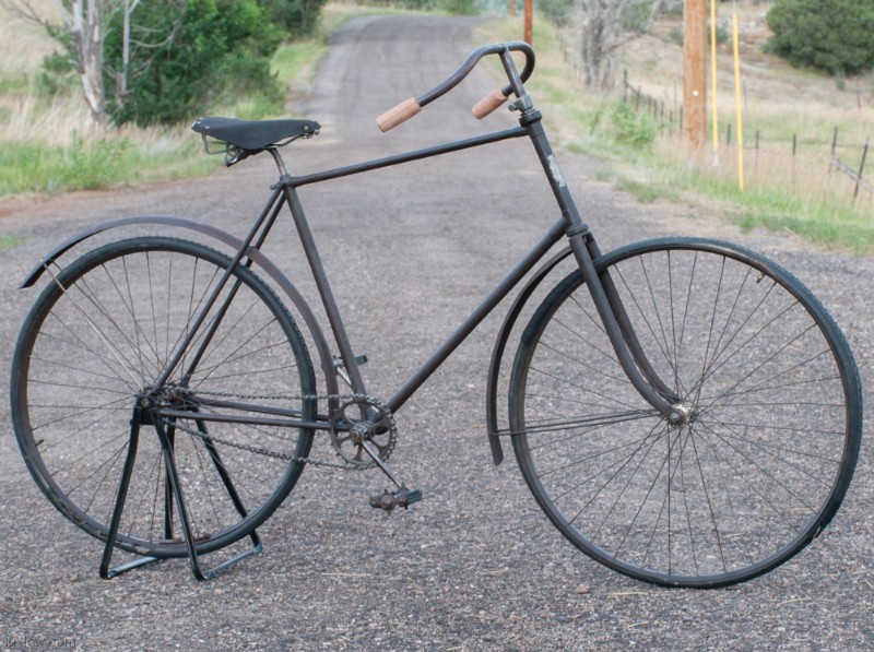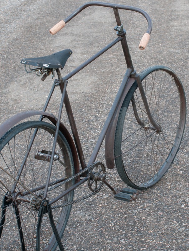 This Old Duke Featherstone has been Lux Low Patina Restored, Rebuilt, and Resuscitated. What’s left of Original Paint is deep cleaned and sealed. The Bike is Quality Construction with unique parts: Unique Hanger with Cottered Cranks, Chainring & Pedals, Big Block Chain 28″ fixed gear rear wheel and 30″ front wheel with fenders, and long swooping handlebars. The Bike was restored as found, the non drive side has a replacement crank and pedal. The leather saddle and faux foam wood grips are blending replacements, since I could not find proper parts. She is a cool looker, but I would say the wheels and Pneumatic tires are the main reason she is not on the road. A Good Piece of History for a Collection or Display.
