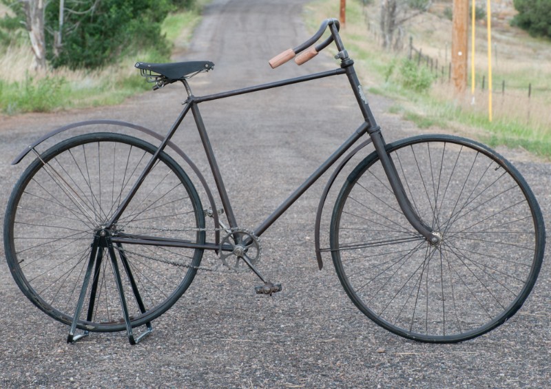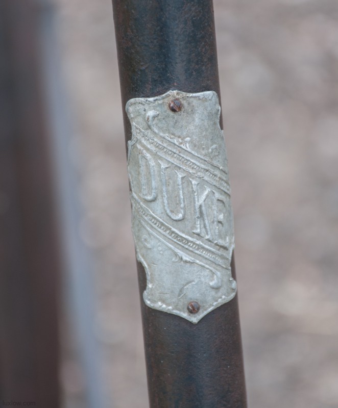 This 1892 Featherstone Duke is a nice example of an early Turn of the Century Scorcher Safety Bicycle. The Duke is a Fixed Gear Safety Bicycle made by A. Featherstone & Company who made High Quality Bicycles out of Chicago, Illinois USA. Scorcher Safety Bicycles had unique look with long head tube and progressive sloped top tube. The Scorcher frame was only used for a few years in the beginning of the seen safety bicycle era. This Duke Scorcher has a 30″ front wheel and 28″ rear wheel with Deluxe Features of Fenders and Pneumatic Tires.