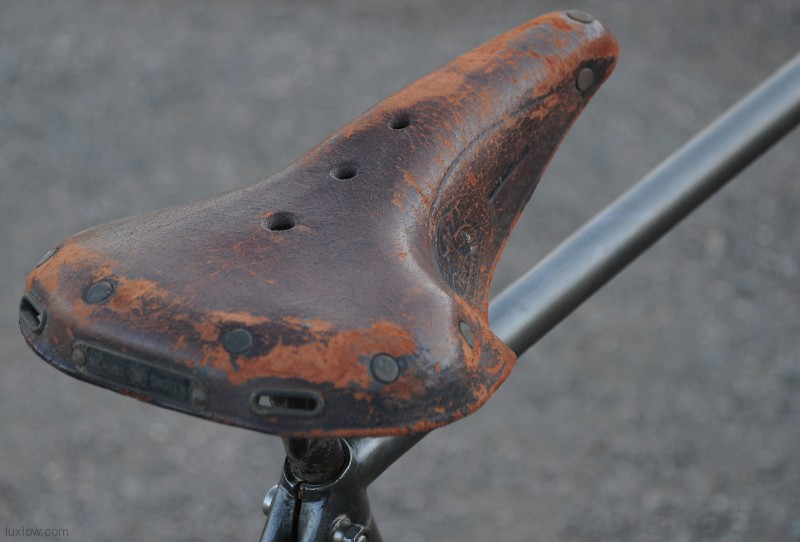 This Old 1911 Rambler has been Lux Low Restored and Resuscitated. She is missing her traditional black coat due to the many years of use, but finished raw to show off the construction ” Notice the Unique Frame Lugs “. The Bike was restored as found and the Wood Wheels were added to correct the build. The Early clincher type wood rims are 28″ x 1 1/2″ and have decent Blackwall Tubular tires that hold some shape but not air. The Wheels are laced with original spokes to a front Barrel hub and a nice rear New Departure Model A Coaster Brake Hub. The Bike has Cool Unique G&J Rambles bottom bracket, crank, sprocket, and Skiptooth chain drive. Bike Has Mustache Bars and old Leather Saddle. She’s a cool Old Ride that has seen some use, Although Completely Rebuilt, I would say that she’s not road worthy due to the condition of the wood rims & tubular tires. but She still shows her Unique Beauty.This Bicycle is Rebuilt, Cleaned, and Sealed. This Bicycle would Be Perfect For a Collection, Conversation or Decoration. Click here for Details of the Lux Low Vintage Patina Restoration Process on this Bike.