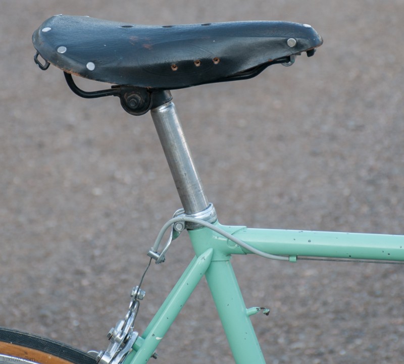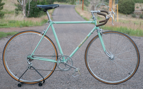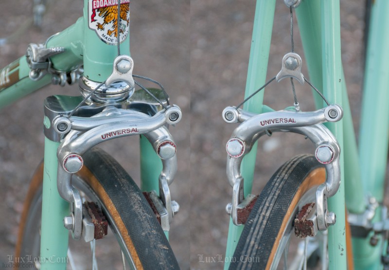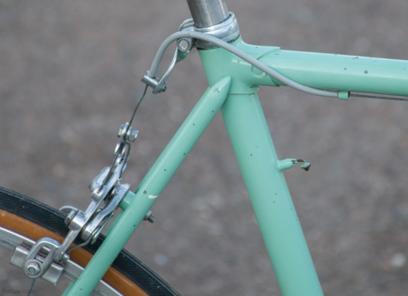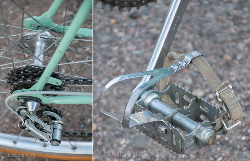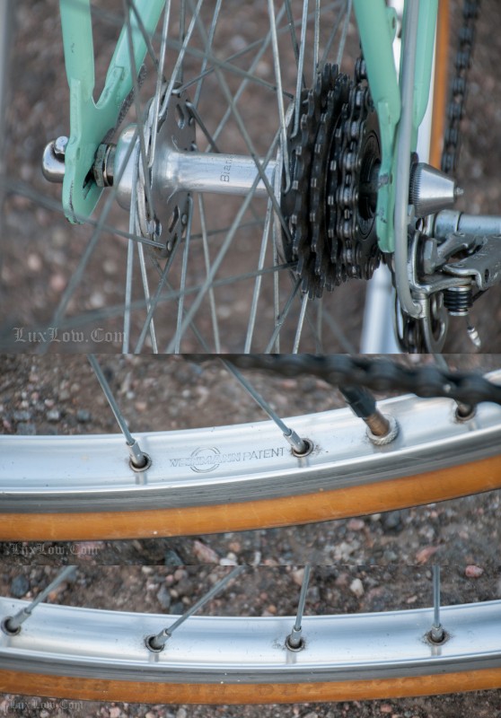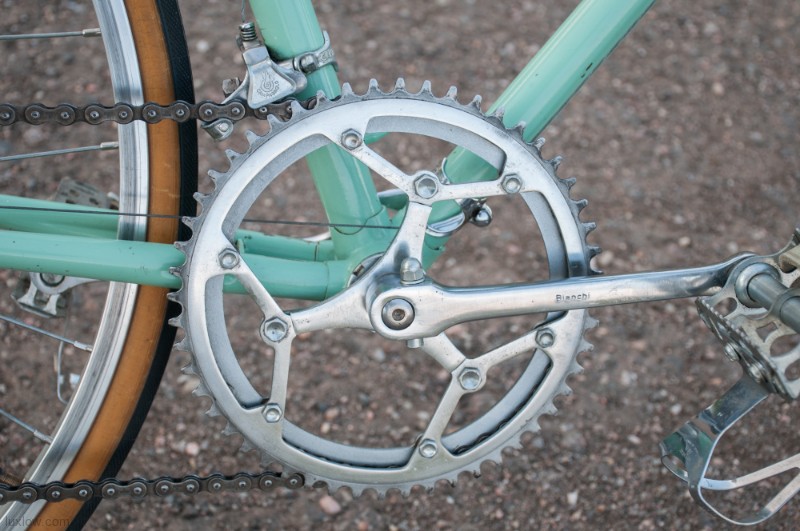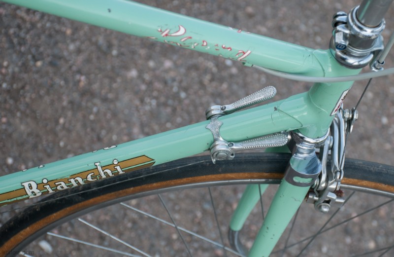 The “Record” a term for excellence on Campagnolo Parts is used on this lower end Bianchi Bike. Never the Less this in a Nice Example of Early Mass Produced Bicycle. The Paint is decent, has decal loss some cracking in the paint around the head tube and bike has a kick stand at one point, thus some dents on the bottom. The Bike measures 54.5cm from the center of the bottom bracket to the center of the top tube or 56cm Center to Top of the top tube, Since the bike has Seat post clamp the Seat tube measures 57.5cm crank center to clamp top. The top tube is 56cm center to center. The Frame and Fork are Steel Tubing. The bike has Bianchi Parts: Cottered Cranks, Headset, Seat post Clamp, and Rear Hub. Universal Brakes and Levers and Campagnolo Valentino Extra Shifters and Dérailleurs, has a 3TTT Stem and Wrights Leather Saddle. The wheels are 27″, The rear has a Bianchi Freewheel hub that is laced to a Weinmann Rim, the front is Normandy that I believe is just an replacement. Interesting Old Bike & Survivor.Local Sale: Cash Pickup in Golden, Colorado. Cash Price is Lower than our web posted prices.