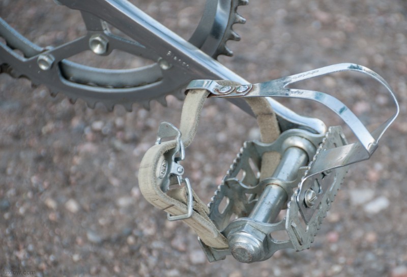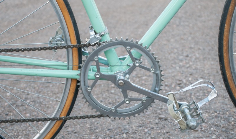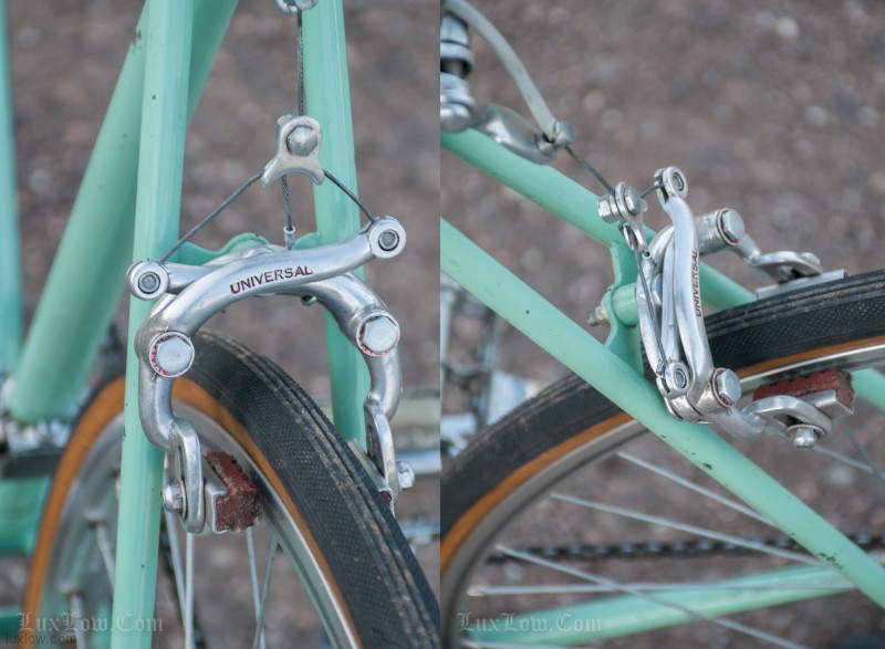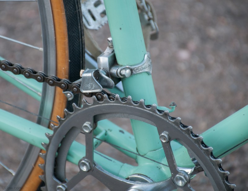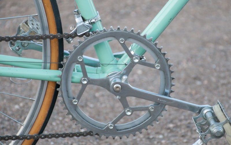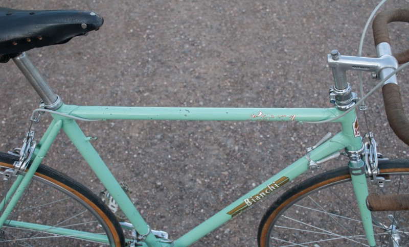 The “Record” a term for excellence on Campagnolo Parts is used on this lower end Bianchi Bike. Never the Less this in a Nice Example of Early Mass Produced Bicycle. The Paint is decent, has decal loss some cracking in the paint around the head tube and bike has a kick stand at one point, thus some dents on the bottom. The Bike measures 54.5cm from the center of the bottom bracket to the center of the top tube or 56cm Center to Top of the top tube, Since the bike has Seat post clamp the Seat tube measures 57.5cm crank center to clamp top. The top tube is 56cm center to center. The Frame and Fork are Steel Tubing. The bike has Bianchi Parts: Cottered Cranks, Headset, Seat post Clamp, and Rear Hub. Universal Brakes and Levers and Campagnolo Valentino Extra Shifters and Dérailleurs, has a 3TTT Stem and Wrights Leather Saddle. The wheels are 27″, The rear has a Bianchi Freewheel hub that is laced to a Weinmann Rim, the front is Normandy that I believe is just an replacement. Interesting Old Bike & Survivor.Local Sale: Cash Pickup in Golden, Colorado. Cash Price is Lower than our web posted prices.