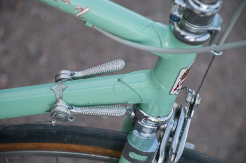 This is an Old Vintage Bianchi 56cm 8 Speed Road Racing Bike from 1969 in Iconic Celeste Color. Edoardo Bianchi is a Famous Italian entrepreneur and inventor who founded the bicycle manufacturing company Bianchi in 1885. The Bianchi Record bicycle is an example of a Bianchi’s attempt to reach mass markets. A lower end Bike with Bianchi labeled parts and newly introduced Campagnolo Valentino Extra Shifters and Derailleurs. This is a Cool Bicycle, although a Lower end bike, it survived.