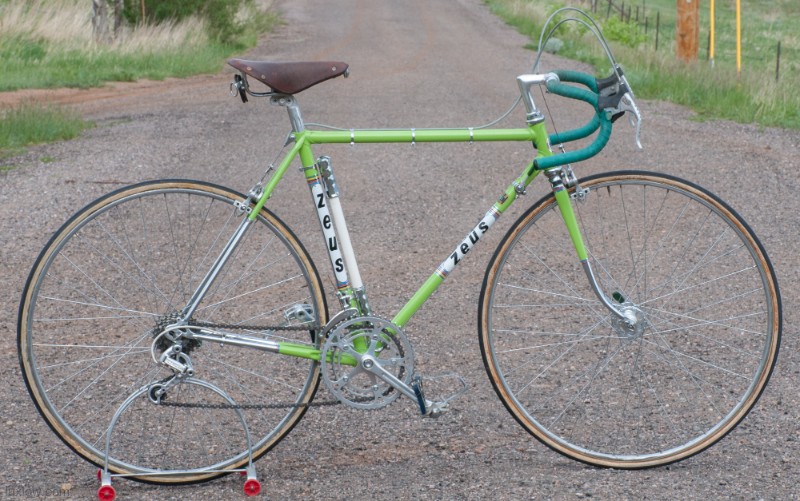 This Zeus is Ready to go with Patina Intact, although it’s Not a Lux Low Patina Restore. The bike came from a Respected Collector / College who had the bike rebuilt or at least kept up with proper service. The Bike measures 52cm from the center of the bottom bracket to the center of the top tube or 53.5cm Center to Top of the top tube. The top tube is 53cm center to center. The Frame and Fork are Reynolds 531 Steel Tubing wit Zeus Lugs and Dropouts. The bike has Zeus Parts: Cranks, Hubs, Headset, Bottom Bracket, Seatpost, and Zeus 2000 Brakes. The Dérailleurs look to be changed out an one time, front is Campagnolo and rear is a Shimano Crane. Bike has a Ideale Leather Saddle, 700c wheels with Tubular Rims and Tubular tires, and Zeus accessories Pump and Spare tubular holder. I acquired a Beautiful collection of Vintage Road bikes and I Really like this Bike, Although I Consider this one of my Personal bikes everything is for sale. Enjoy.