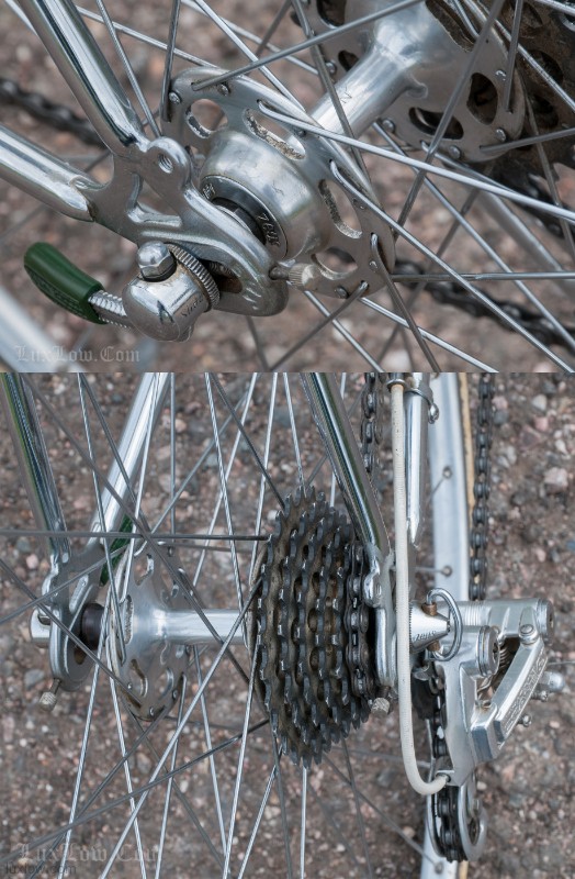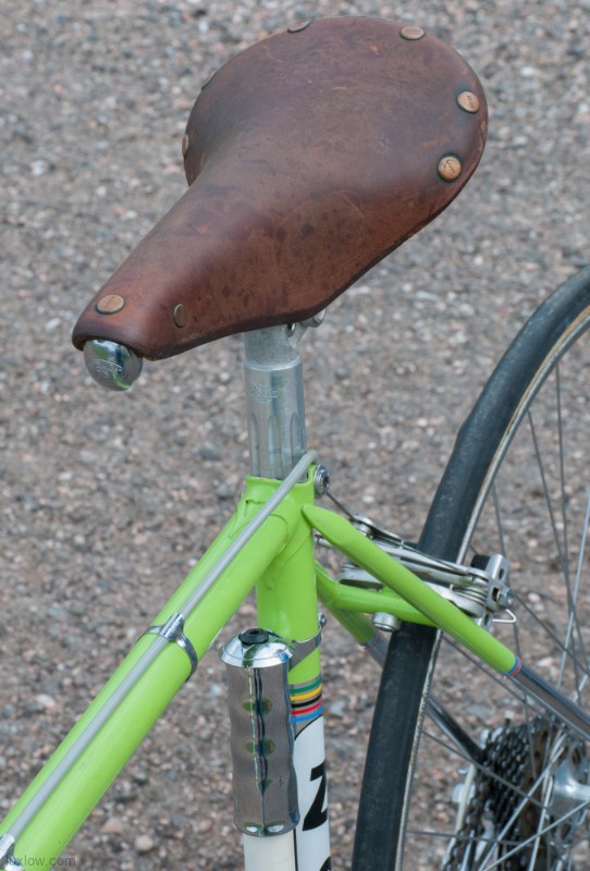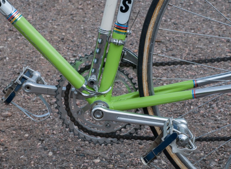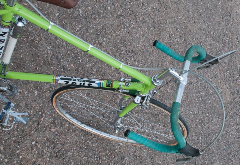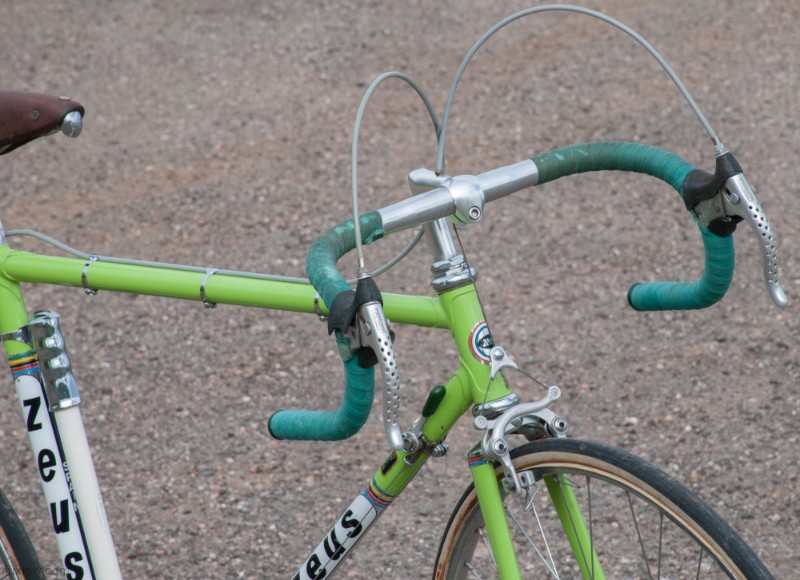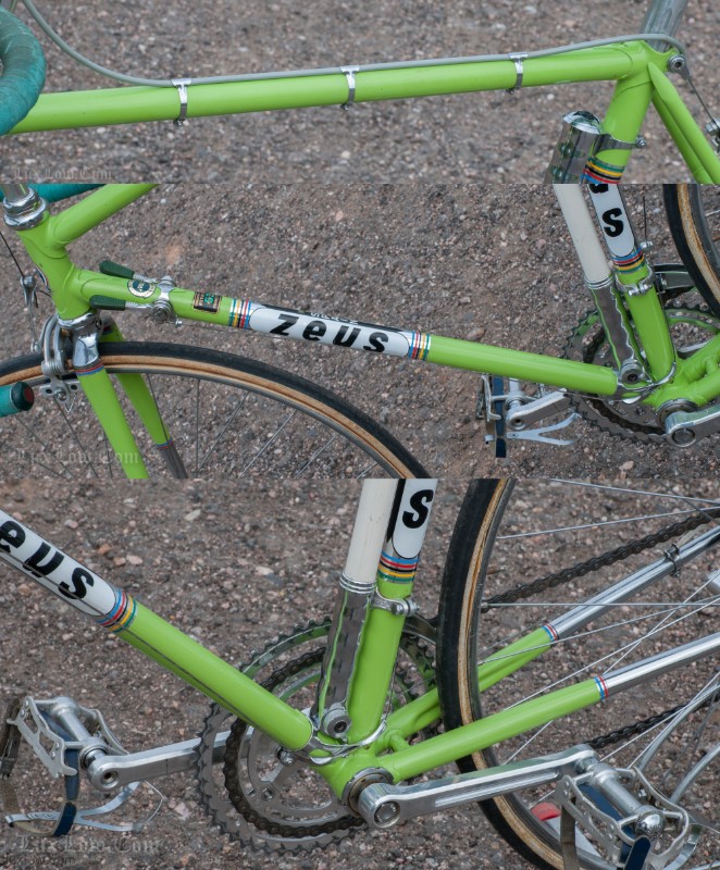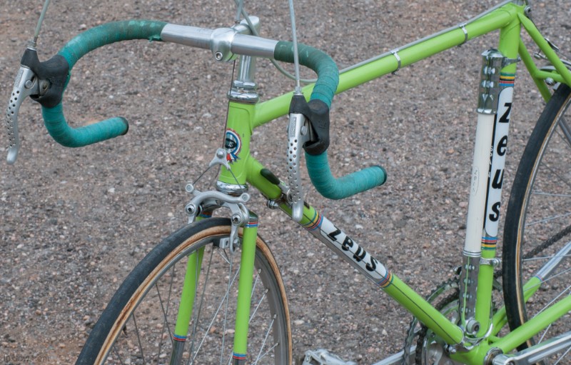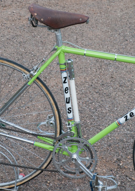 This Zeus is Ready to go with Patina Intact, although it’s Not a Lux Low Patina Restore. The bike came from a Respected Collector / College who had the bike rebuilt or at least kept up with proper service. The Bike measures 52cm from the center of the bottom bracket to the center of the top tube or 53.5cm Center to Top of the top tube. The top tube is 53cm center to center. The Frame and Fork are Reynolds 531 Steel Tubing wit Zeus Lugs and Dropouts. The bike has Zeus Parts: Cranks, Hubs, Headset, Bottom Bracket, Seatpost, and Zeus 2000 Brakes. The Dérailleurs look to be changed out an one time, front is Campagnolo and rear is a Shimano Crane. Bike has a Ideale Leather Saddle, 700c wheels with Tubular Rims and Tubular tires, and Zeus accessories Pump and Spare tubular holder. I acquired a Beautiful collection of Vintage Road bikes and I Really like this Bike, Although I Consider this one of my Personal bikes everything is for sale. Enjoy.