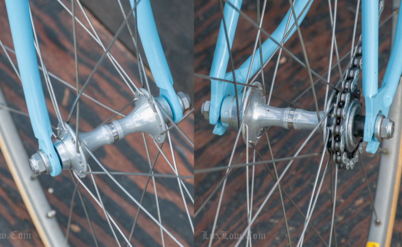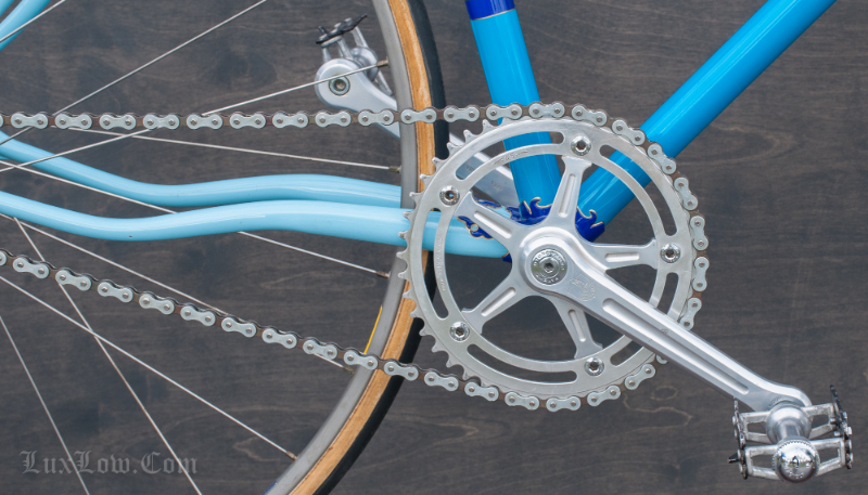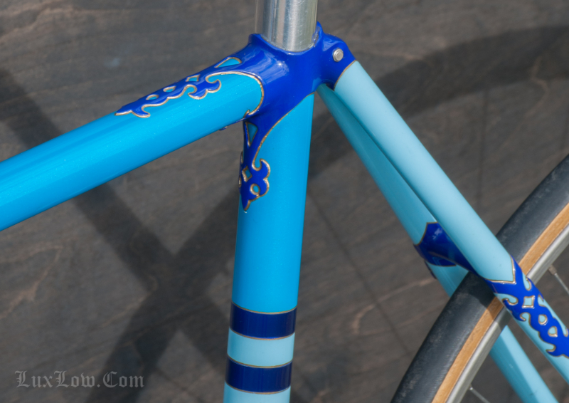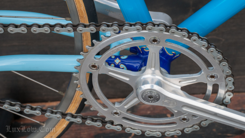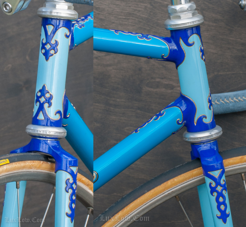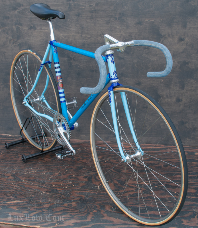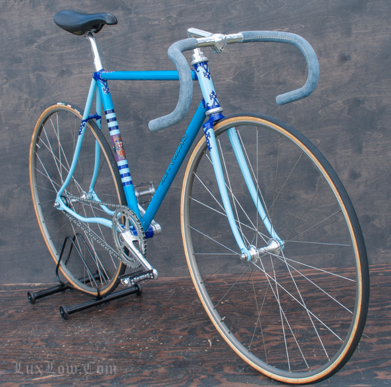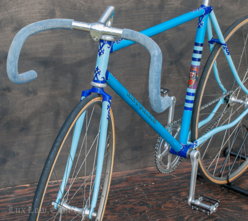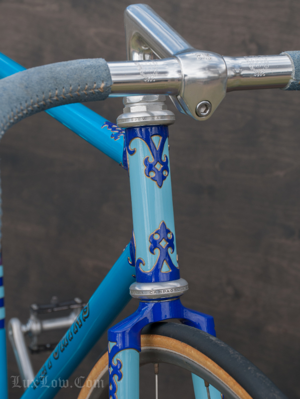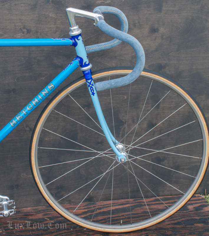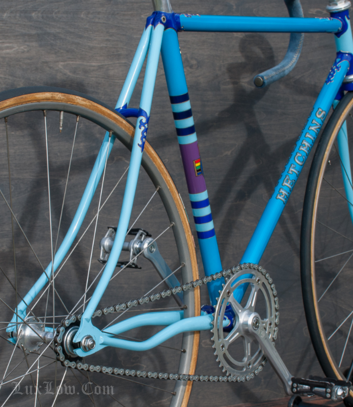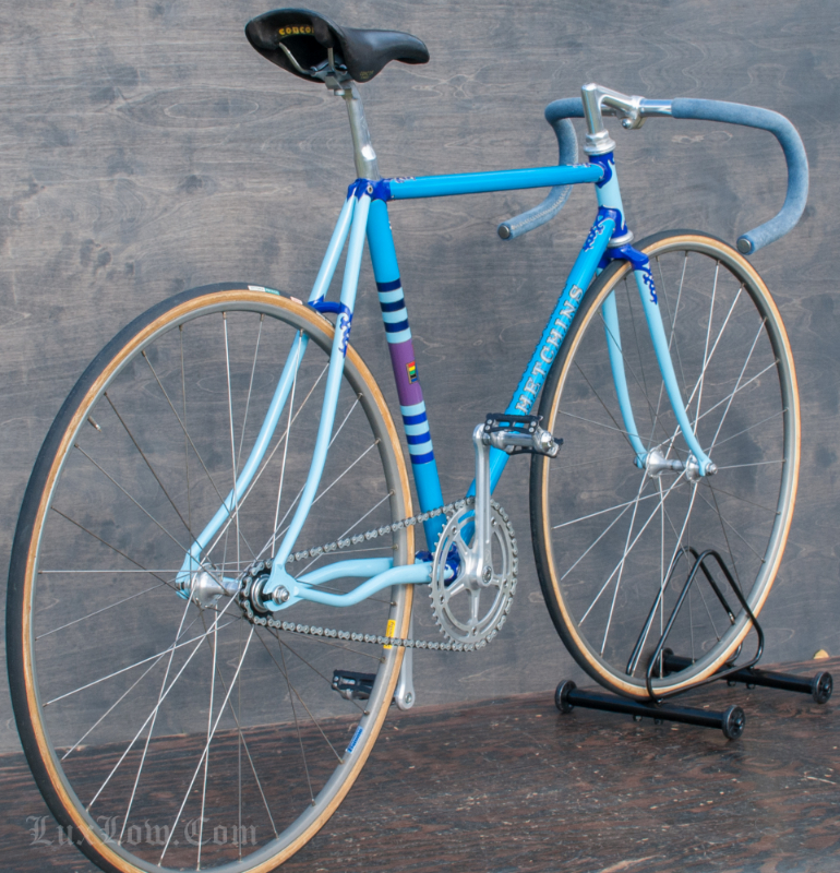 This 50cm Hetchins is a Stunning Piece of History, Art, and Beauty. The Bike measures 48.5cm from the center of the bottom bracket to the center of the top tube or 50cm Center to Top of the top tube. The top tube is 52cm center to center. The Head tube is 118mm tall at a 73 degree angle. The seat tube angle is 75.5 Degrees. The Frame and Fork are Columbus PL Steel Tubing, Fully Silver Soldered, with Campagnolo Dropouts. Brian’s custom frame order form from Hetchins comes with this bicycle. The bike has Top of the line Campagnolo Parts: Mostly Super Record Group. Cranks, Headset, Bottom Bracket, Seatpost, & Pedals, Nice Stuff. Bike has a Concor Leather Saddle, 3ttt Stem and Handlebars with sewn Blue Suede Leather Wrap. 700c track wheels with C Record Track Hubs laced to Fiamme Speedy Rims and Tubular tires. This is a Bob Jackson owned Hetchins Built Frame. The Bike is Gorgeous and saw low to no miles, it is a Sweet Ride, A work of Art, A Piece of History, Preserving Bryan Baylis’s Artisan Paint Work. Enjoy.