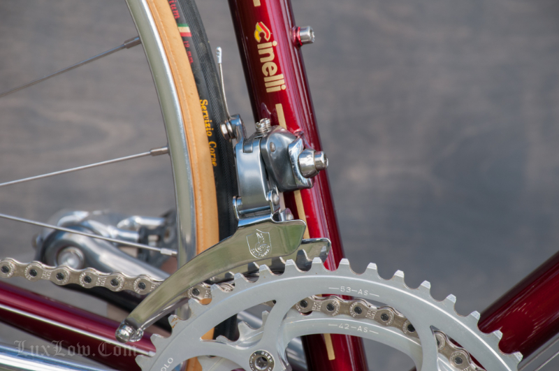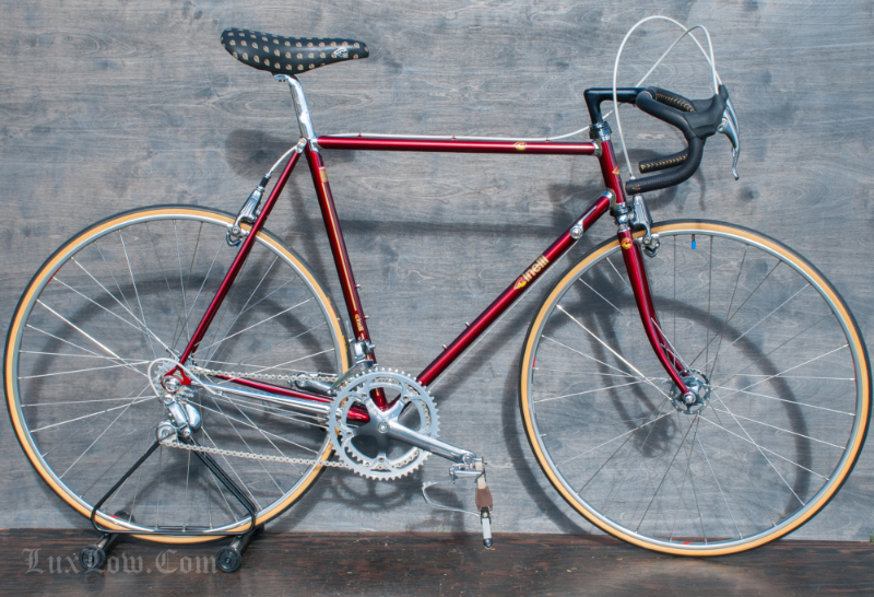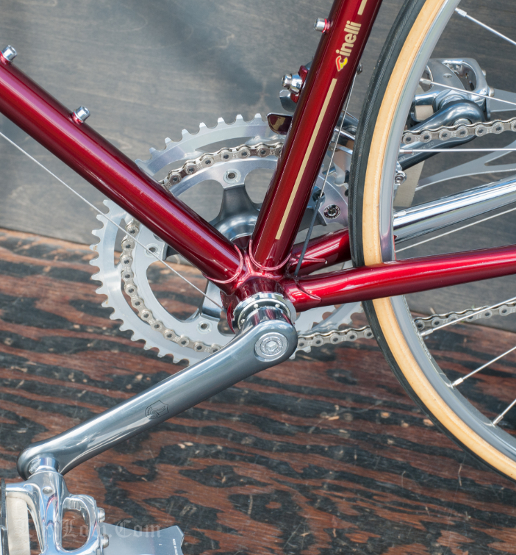 This 57cm Cinelli Supercorsa is a work of Art adorned with Cinelli Limited Edition Parts and Campagnolo Century Finish Parts, Although the Bike is assembled, it is all New Old Stock. The Cinelli Super Corsa is one of the Most Famous Classic Italian Race bikes of all time, and take a look at her She’s a Beauty. This Supercorsa is made according to the original design specifications perfected by Cino Cinelli in the 1960s. The Supercorsa remains 100% Made in Italy from Italian materials, made with Columbus SLX Steel with Cinelli sloping fork crown and fast-back seat stays all ground-breaking technical solutions first developed by Cino himself.