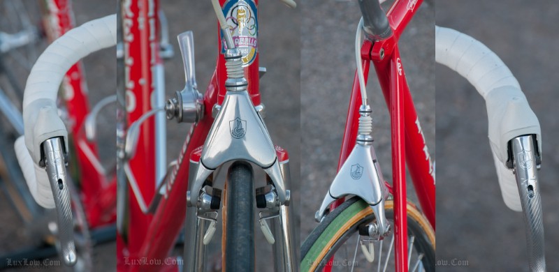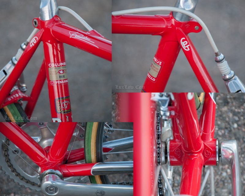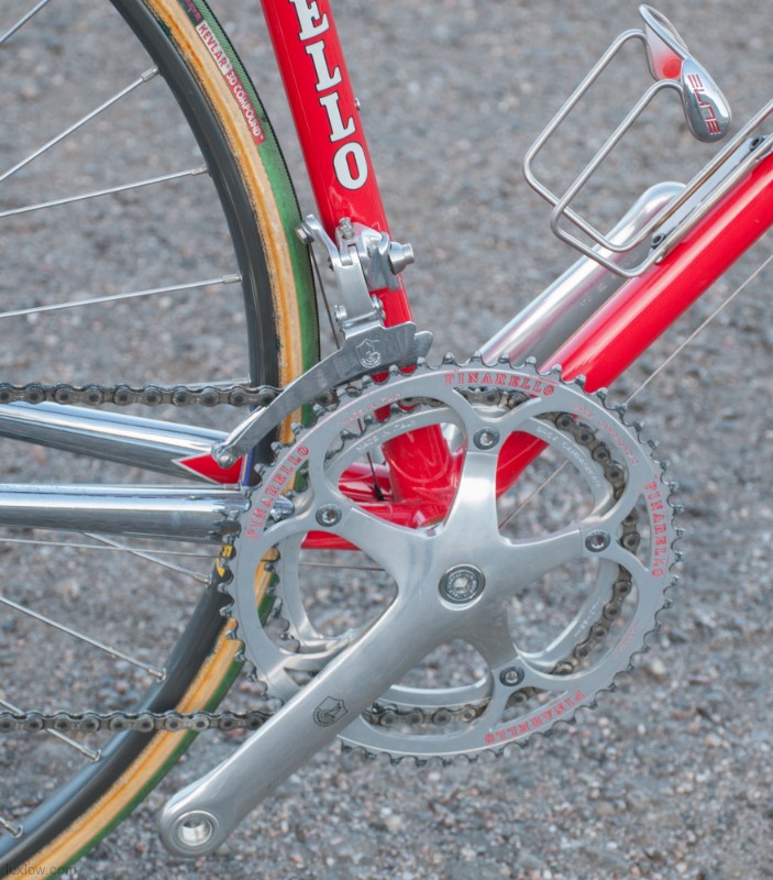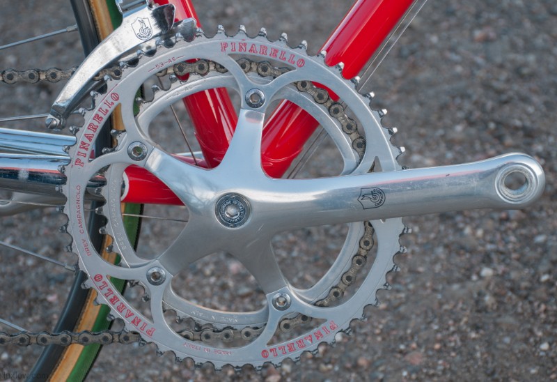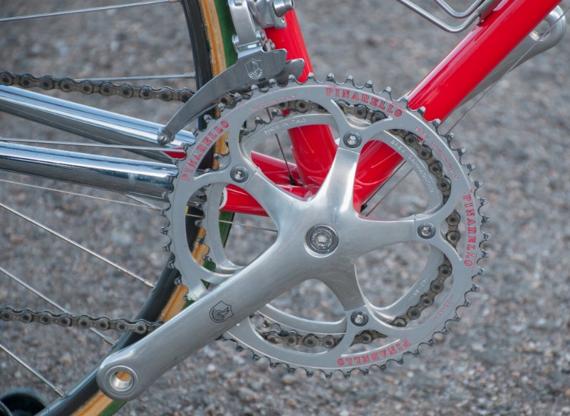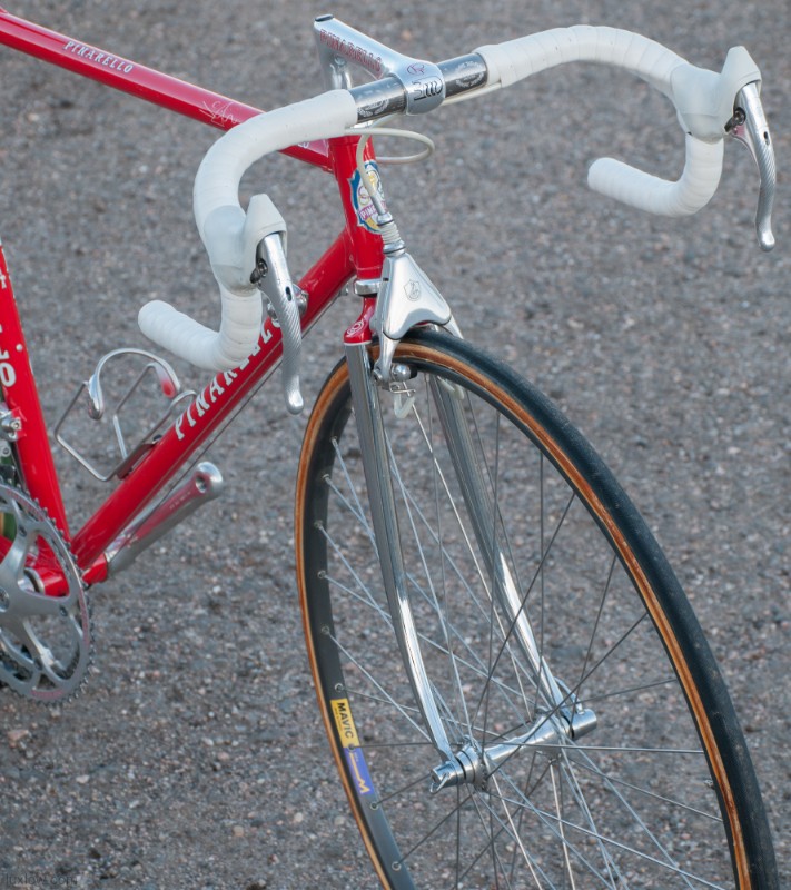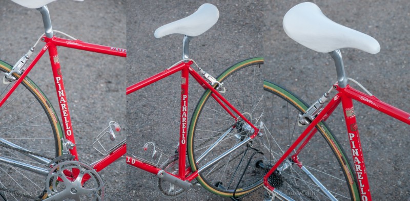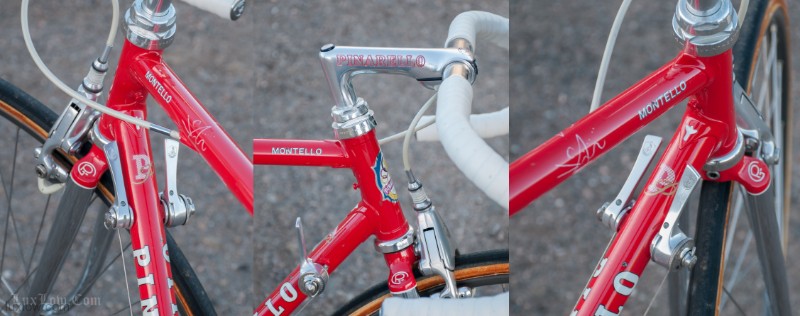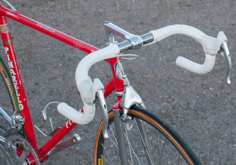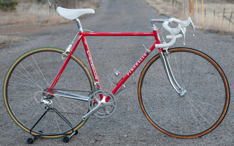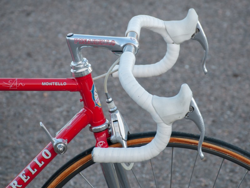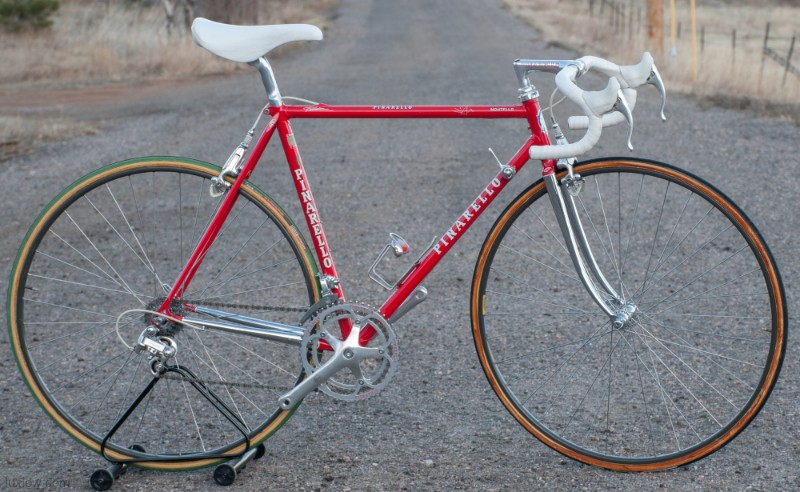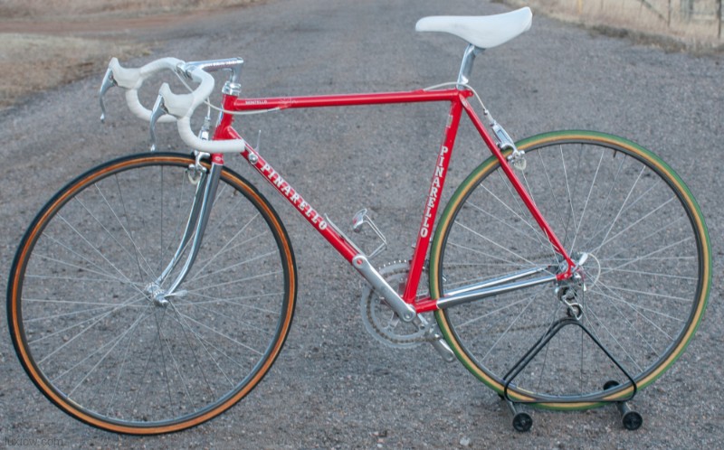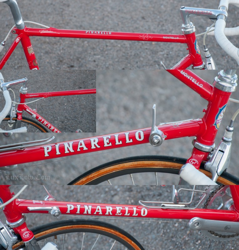 Vintage Pinarello Montello 54cm Red Racing 16 Speed Road Bike with a Beautiful Campagnolo C Record Parts Group. The Pinarello Montello was Pinarello’s Flag ship ” Top of the Line ” Bicycle, and take a look at her She’s a Beauty. The Frame and Fork are Columbus FRX Steel Tubing, FRX was a High End tube set Specifically made for Pinarello.