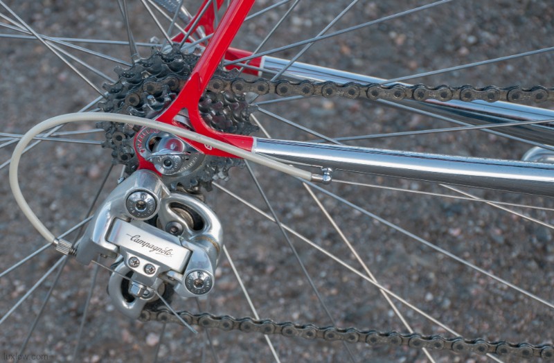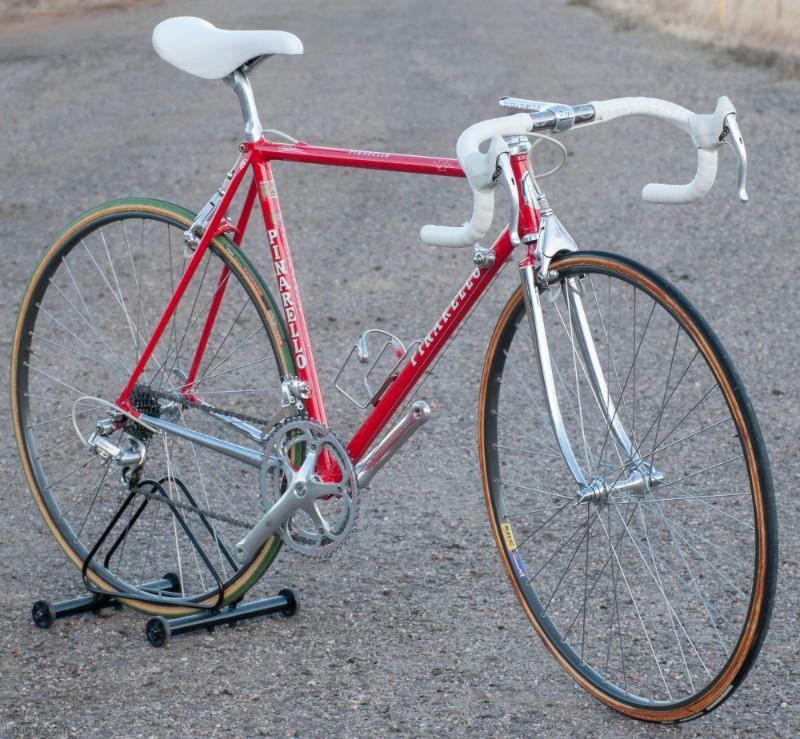I suspect the bike is a 54cm and measures 52cm from the center of the bottom bracket to the center of the top tube or 53.5cm Center to Top of the top tube. The top tube is 53cm center to center and the Head tube is 112mm tall. The Serial Number is H 19XX I had trouble dating it and only can speculate late 1980s to early 1990s. My notes say 1993 but cannot figure where this number came from. I think the Bike is used, but Barely, Although some parts look NOS, It is Stunning, has Real Nice Original paint, it has very few nicks and a smudge that are hard to spot, top tube sticker has slight peal. She is pretty immaculate, barely used or somebody’s restoration. The bike has Campagnolo Corsa Record Parts and all look NOS: Cranks, Front and Rear Dérailleurs, Syncros Shifters, Headset, Bottom Bracket, Seat post, Delta Brakes, and Levers, Real Nice Stuff, Possibly NOS. The headset top nut has slight chew and the Pantographed Chain Rings have Grease, and appear they could be used. Bike has San Marco Laser Saddle, Pinarello 3TTT Stem and 3TTT Competizione Handlebar. The wheels are 700c Campagnolo C Record Hubs laced to Mavic GP4 Tubular rims with tubular tires. Rims Show No brake surface wear but the green rear tubular does not hold air very long. This is a Super Sweet Italian Vintage Bike for a Collecting or a Retro L’Eroica Rider.Local Sale: Cash Pickup in Golden, Colorado. Cash Price is Lower than our web posted prices.