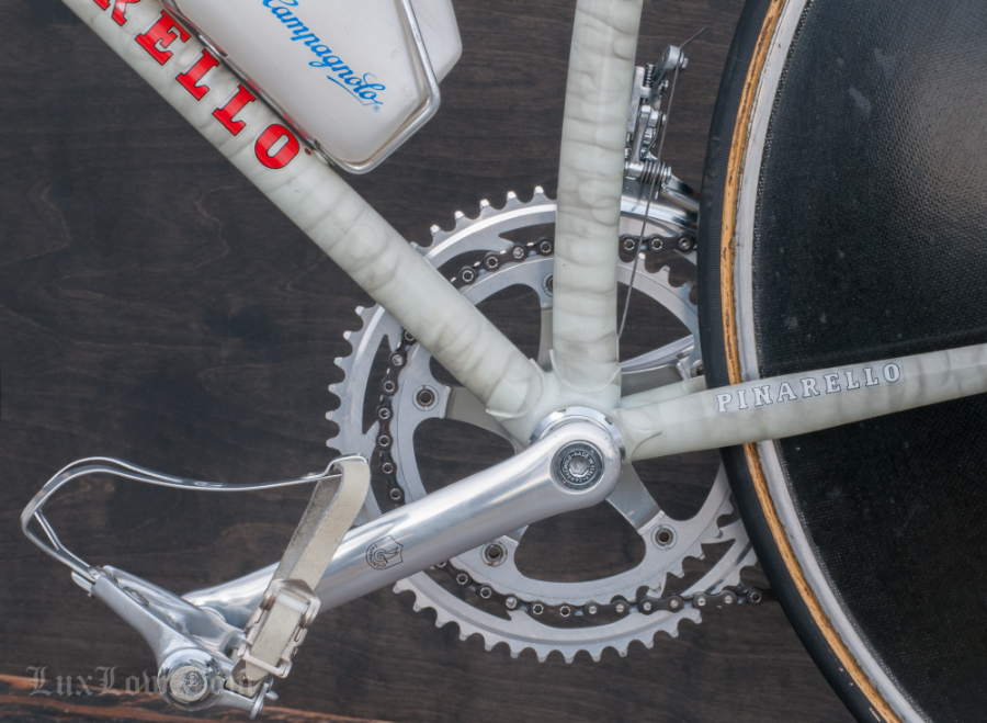Vintage Pinarello Prologo Smoke 58cm Time Trial Racing 14 Speed Road Bike with a Beautiful Campagnolo C Record Parts Group. The Prologo was Pinarello’s Time Trail bike designed to go fast against the clock. The Frame and Fork are Columbus Cromor Steel Tubing, Light weight with Extra Strength to handle some heavy & hard pedaling. The Prologo took some Victories with this Cool Iconic Look & Design.